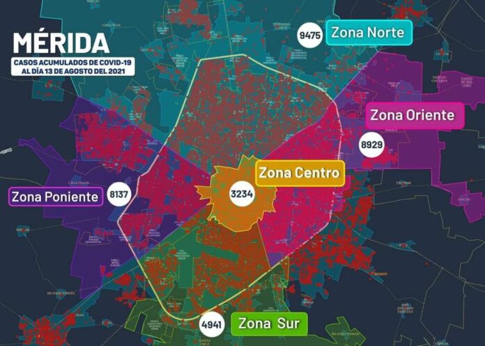 Específicamente, en Mérida se han diagnosticado 34,716 personas contagiadas de Coronavirus (casos acumulados al 13 de agosto), que viven en: