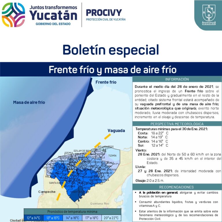 Mérida, Yucatán, 26 de enero de 2021.- Con un llamado a salvaguardar la salud, el Gobierno de Mauricio Vila Dosal invita a la población a protegerse ante el frente frío No. 32 que ingresará al territorio yucateco, a partir del próximo jueves 28 de enero.