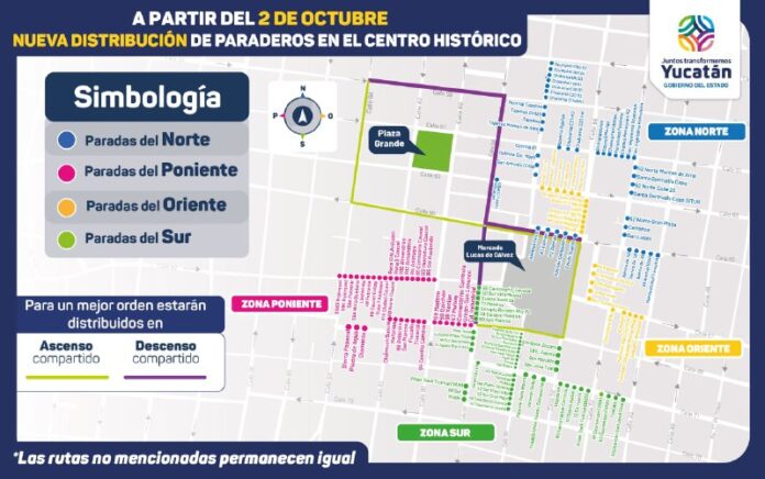 También, la ruta Salvador Alvarado-Granja Real y Salvador Alvarado cambiará su zona de ascenso a la calle 67 x 50 y 52, y de descenso a la calle 52 x 67 y 69; Villas de Oriente Rojo y el Azul tendrá su ascenso en la calle 63 x 54 y 56, y su descenso en la calle 65 x 54 y 56; y el de 65 Periférico Amalia y Coca pasó su punto de ascenso a la calle 54ª x 65 y 67, y de descenso a la calle 65 x 52 y 54.