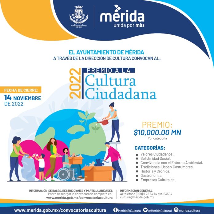 Mérida, Yucatán a 28 de septiembre de 2022.- Para reconocer aportaciones de las y los meridanos en materia de arte, valores cívicos y el trabajo ciudadano que construyen la cultura de una ciudad, el Ayuntamiento de Mérida abre las convocatorias al Premio a la Cultura Ciudadana 2022 y a la Medalla “Silvio Zavala” a la Cultura y las Artes 2023. Ambas iniciativas permiten también visibilizar el trabajo de personas y agrupaciones comprometidas y sensibles que conducen al esfuerzo social para el bien común de la sociedad.