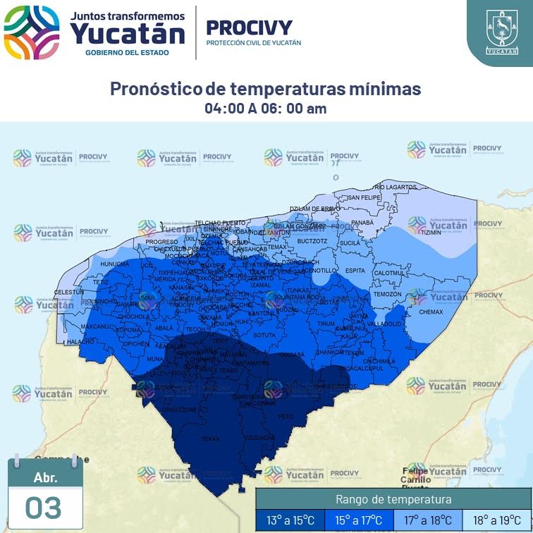 Mencionó que desde este jueves 1 de abril se espera llegue a Yucatán un sistema de frente frío que originará lluvias ligeras a moderadas y refrescamiento de las temperaturas, pues las mínimas esperadas a partir del jueves son de 17 a 19 grados en el litoral y de 15 a 17 grados en el resto del estado.