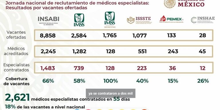 Los 2 mil 621 médicos especialistas contratados representan al 18 por ciento de las vacantes que se ofertaron, por lo que se mantendrá abierta la convocatoria para que los especialistas puedan aplicar y así cubrir el resto de las vacantes.