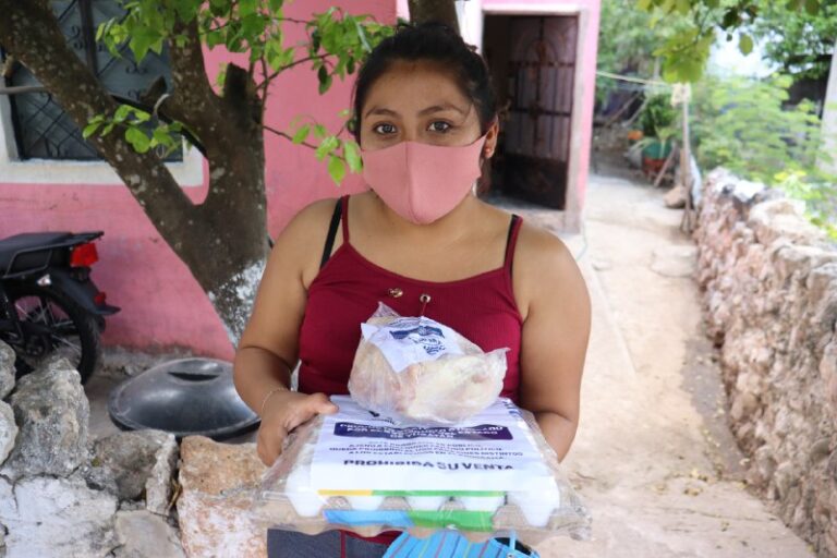 Debido a la contingencia, los ingresos disminuyeron en casa de doña Merly Cocom Chan, pues las ventas de la panadería donde trabaja su marido bajaron, sin embargo, gracias a esta estrategia, ella y su familia mejorarán sus condiciones de vida. «Estoy muy contenta, este pollo fresco y mi rejilla de huevos nos serán de mucha utilidad para mis hijos y para mí», comentó.