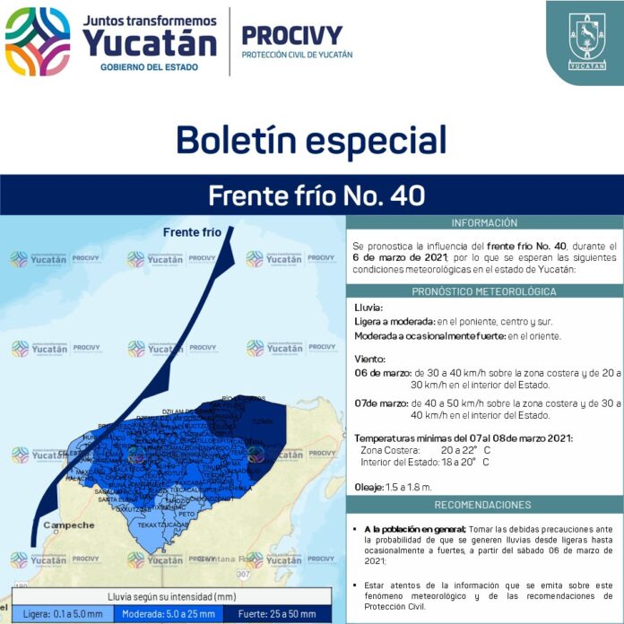 Mérida, Yucatán, 5 de marzo de 2021.- La Coordinación Estatal de Protección Civil (Procivy) pronostica que, este sábado, el frente frío número 40 provocará lluvias moderadas en el poniente, centro y sur de la entidad, y ocasionalmente fuertes con actividad eléctrica en el oriente, por lo que recomienda a la población tomar precauciones.