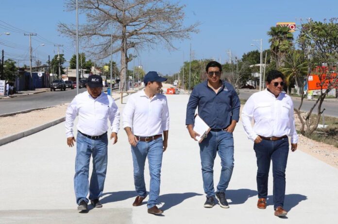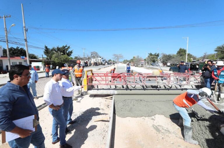 Vila Dosal constató las labores, que se realizan en el tramo del Periférico de Mérida a “La plancha”, donde cuadrillas de trabajadores del Gobierno colocan el pavimento de concreto, el cual es bajo en carbono, contribuirá a reducir las emisiones y hará de este un medio de movilidad amigable con el medio ambiente.