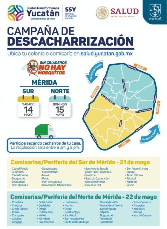 El próximo sábado 14 de mayo, las brigadas trabajarán en las colonias de la zona sur y el domingo 15, tocará al sector norte; en tanto, las comisarías, colonias y fraccionamientos aledañas a la periferia de la capital, se atenderán el sábado 21, para la zona sur y el domingo 22, para la región norte; estas labores de descacharrización se llevarán a cabo en coordinación con el Ayuntamiento de Mérida.