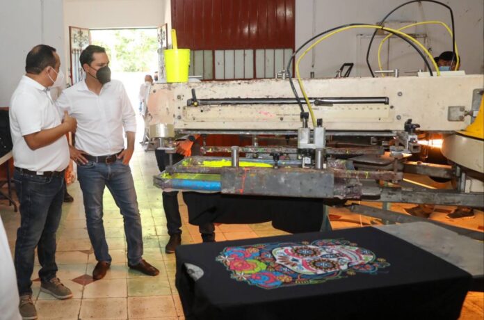 Acompañado del presidente de la Junta de Gobierno y Coordinación Política del Congreso del Estado, Víctor Hugo Lozano Poveda, el Gobernador realizó un recorrido por el área de producción del sitio, donde los trabajadores, que son oriundos de Mérida, su comisaría de Cholul y el municipio de Conkal, estaban realizando serigrafía en playeras y material para bolsas.