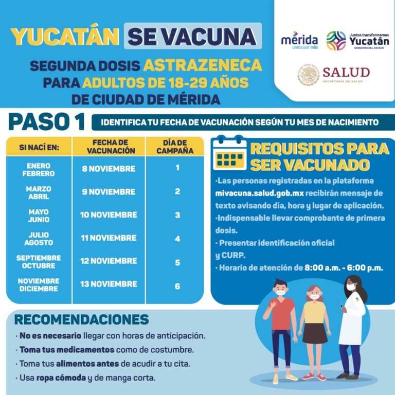 Del lunes 8 al sábado 13 de noviembre se aplicará la segunda dosis de la vacuna contra el Coronavirus a jóvenes de 18 a 29 años de Mérida, proceso que se realizará de manera coordinada entre el Gobierno del Estado, el Ayuntamiento de Mérida y la Secretaría de Bienestar.