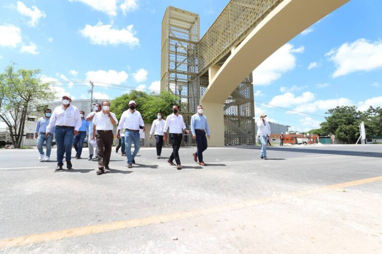 Como parte de su trayecto, el Gobernador también descendió en el paradero número 91 instalado en el kilómetro 48 a la altura de fraccionamiento Tixcacal Opichén, donde verificó el progreso de la edificación del puente peatonal en forma de Y, así como de los pasos peatonales que lo conectan con una nueva banqueta con las dimensiones necesarias para persona con discapacidad motriz en silla de ruedas.