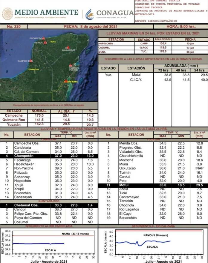 Durante el día sábado en Yucatán la lluvia máxima fue 29.5 milímetros registrada en Motul. La temperatura máxima fue de 36.0 °C registrada en Mococha y Oxkutzcab y en Mérida (observatorio) fue de 34.5 °C. La mínima de 18.5 °C en Motul. Para mayor información consultar https://Twitter.com/conaguayucatan.
