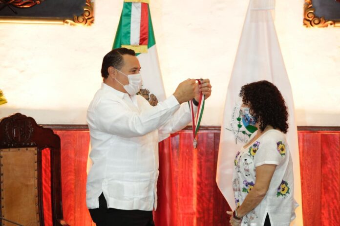 Durante la Sesión, que se transmitió a través del canal oficial de Youtube del Ayuntamiento de Mérida, la regidora Karla Salazar González, dio lectura al dictamen de la Comisión de Postulación de la medalla Héctor Herrera “Cholo” y presentó la semblanza de la homenajeada.