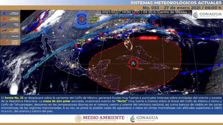 Se prevé que el frente frío No.32 se desplace hasta el centro del golfo de México internándose hasta el sur de Veracruz, sin embargo, la formación de una vaguada pre- frontal sobre la península de Yucatán, propiciará el incremento de nublados vespertinos a nocturnos, con probabilidad para intervalo de chubascos principalmente en sectores del centro y noroeste de Yucatán, norte y suroeste de Campeche y la porción sur de Quintana Roo. El ambiente se mantendrá caluroso durante el día y templado a cálido al amanecer, con vientos del este-sureste, cambiando por la tarde al norte-noreste de 15 a 25 km/h con rachas mayores a 40 km/h en zonas costeras.