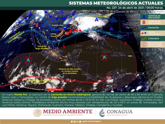 Se prevé que la circulación del anticiclón dominará la península de Yucatán, genera tiempo estable con cielo mayormente despejado y sin probabilidad de lluvias. Lastemperaturas serán calurosas a muy calurosas durante el día y cálidas en la noche, con viento de dirección este-sureste de 20 a 30 km/h y rachas mayores a 50 km/h sobre zonas costeras.