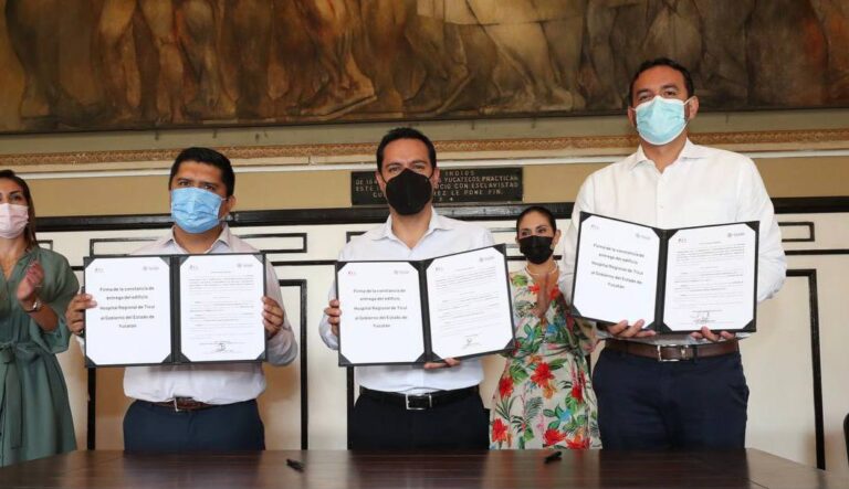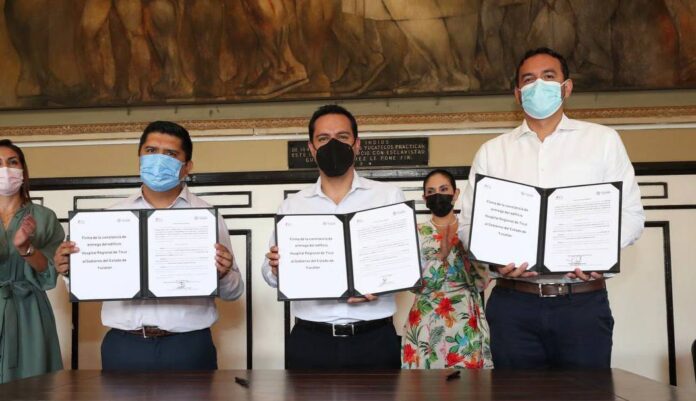 Desde el Salón de la Historia de Palacio de Gobierno, Vila Dosal atestiguó la firma de un convenio entre el titular de la Secretaría de Salud (SSY), Mauricio Sauri Vivas, y el director de Administración y Sistemas de Grupo Marhnos, José Gabriel Bueno Casales, el cual deriva en que, tanto el terreno como el edificio que se construyó, vuelvan a la administración estatal.