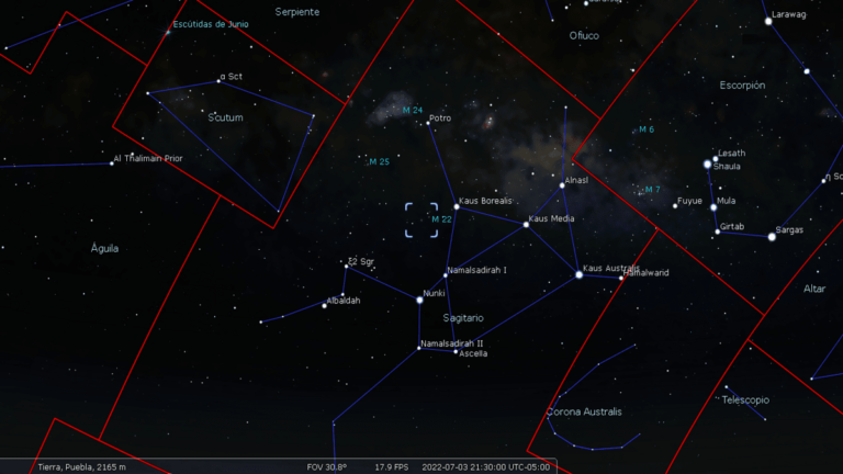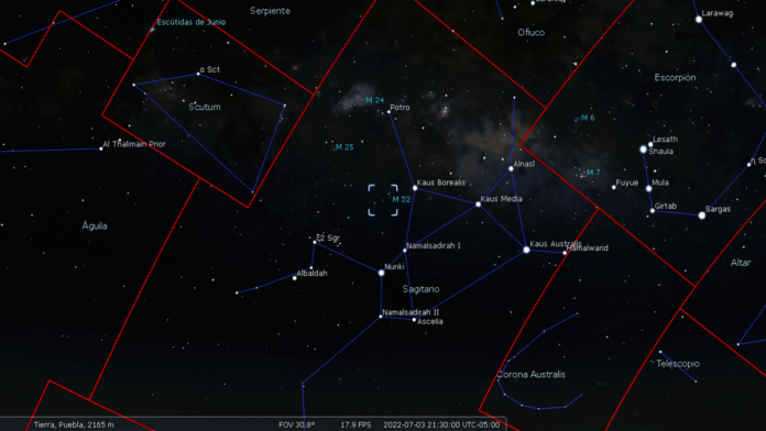 Dos días después llega el cúmulo globular M 22, conocido también como el Gran Cúmulo de Sagitario, en dirección de la constelación de Sagitario, y estará bien ubicado para su observación la mayor parte de la noche, hacia el sureste de la Esfera Celeste. En tres días, habrá dos eventos astronómicos importantes en julio de 2022.