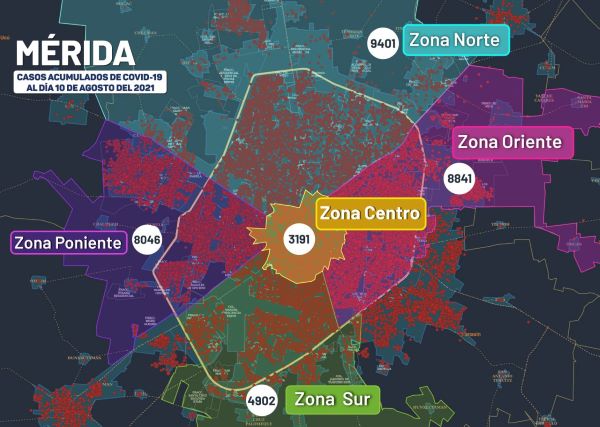 Específicamente, en Mérida se han diagnosticado 34,381 personas contagiadas de Coronavirus (casos acumulados al 10 de agosto), que viven en: