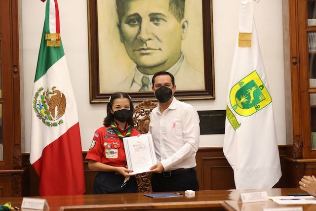En el Salón de los Retratos de Palacio de Gobierno, Vila Dosal recibió el proyecto denominado “Nosotros x Ellos-Áak” que lleva a cabo Andrea para recaudar fondos destinados a la protección de las tortugas, así como la pañoleta e insignias del Grupo Scouts 35 San Felipe Neri al que ella pertenece.