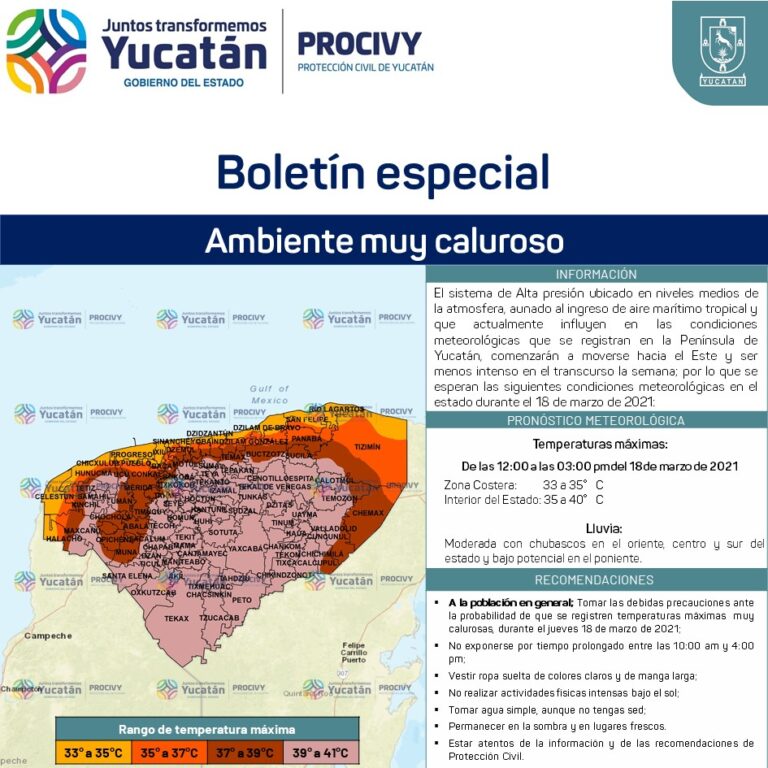 Mérida, Yucatán, 16 de marzo de 2021.- Como ha instruido el Gobernador Mauricio Vila Dosal, la Coordinación Estatal de Protección Civil (Procivy) llama a la población a adoptar precauciones ante el aire marítimo tropical que, al ingresar este jueves 18, propiciará mucho calor, con temperaturas de 33 a 35 grados en la zona costera y de 35 a 41 en el interior del estado.