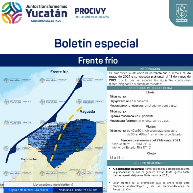 La presencia de este sistema frontal implica temperaturas mínimas de entre 19 y 21 grados en la costa, y de 15 a 17 para el interior, condiciones que podrían persistir hasta el domingo 21. Los vientos esperados son de 30 a 40 kilómetros por hora en la mayoría de los municipios, y de 40 a 50 en el litoral, con oleaje desde 1.5 hasta 1.8 metros de altura.