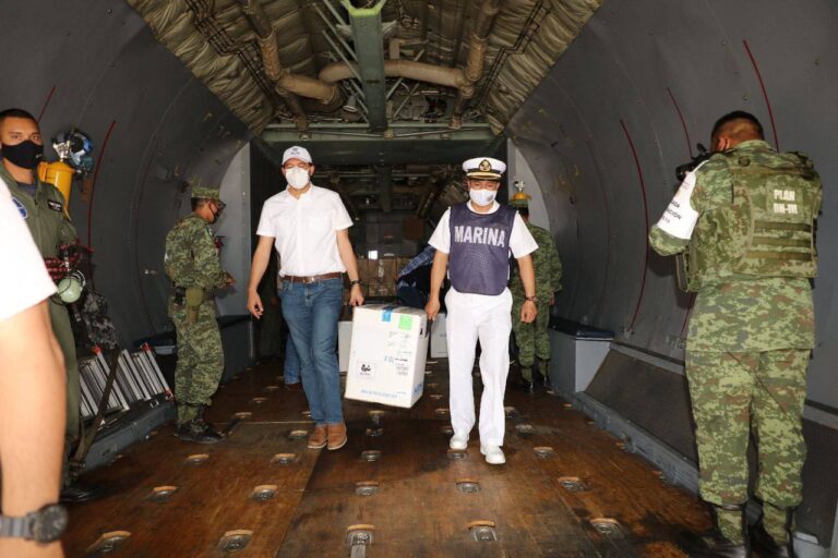 Por instrucciones de Vila Dosal, el titular de la Secretaría de Salud de Yucatán, Mauricio Sauri Vivas, supervisó, en la Base Aérea Militar Número 8, el arribo del nuevo cargamento de vacunas de la farmacéutica Pfizer, el cual llegó a las 11:55 de este día a bordo de una aeronave Hércules matrícula 3611 de las Fuerzas Armadas, proveniente de la Ciudad de México.