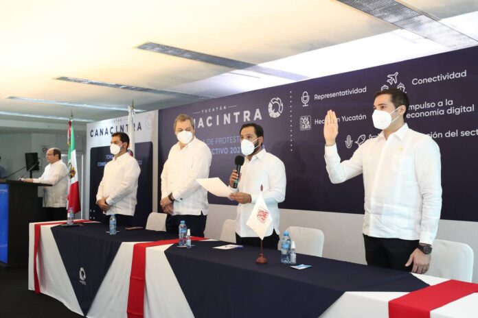 Mérida, Yucatán, 12 de marzo de 2021.- Al encabezar la toma de compromiso del Consejo Directivo 2021-2022 de la Cámara Nacional de la Industria de la Transformación (Canacintra) delegación Yucatán, el Gobernador Mauricio Vila Dosal reiteró la apertura de su administración al diálogo y trabajo conjunto con la iniciativa privada para impulsar el desarrollo del estado mediante la llegada de nuevas inversiones que contribuyan a generar más empleos para los yucatecos.