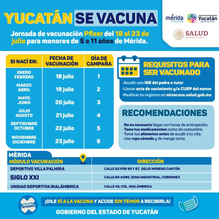 Mérida, Yucatán, 12 de julio de 2022.- La vacunación contra el Coronavirus para menores de 5 a 11 años de Mérida se desarrollará del lunes 18 al sábado 23 de julio, en un operativo conjunto que llevarán a cabo la Secretarías de Salud de Yucatán (SSY) y del Bienestar, así como las Fuerzas Armadas y el Ayuntamiento de Mérida.