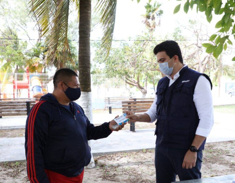 De esta forma, se realizó la entrega de los vales en 14 puntos de Progreso al aire libre donde personal de la Sepasy atendió a no más de 4 personas al mismo tiempo, priorizando la sana distancia, el uso obligatorio de cubrebocas y gel antibacterial constantemente.