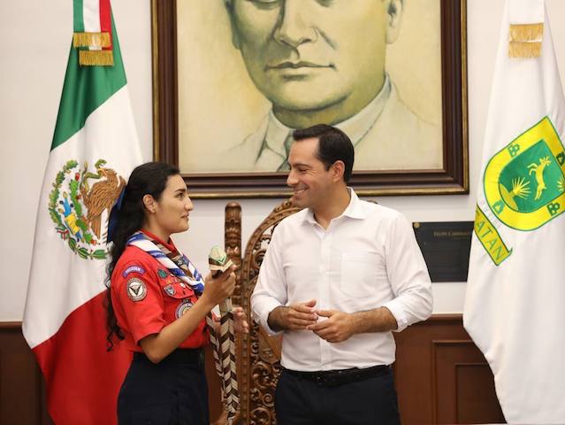 Durante el encuentro, Paz Echeverría entregó a Vila Dosal la insignia que representa al movimiento Scout en la provincia de Yucatán, así como la conmemorativa única de la Semana Scout 2022.