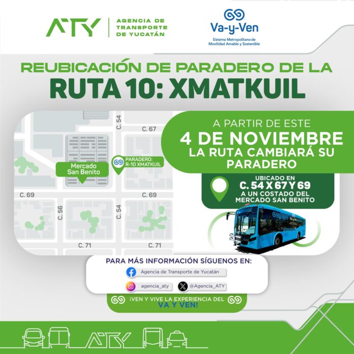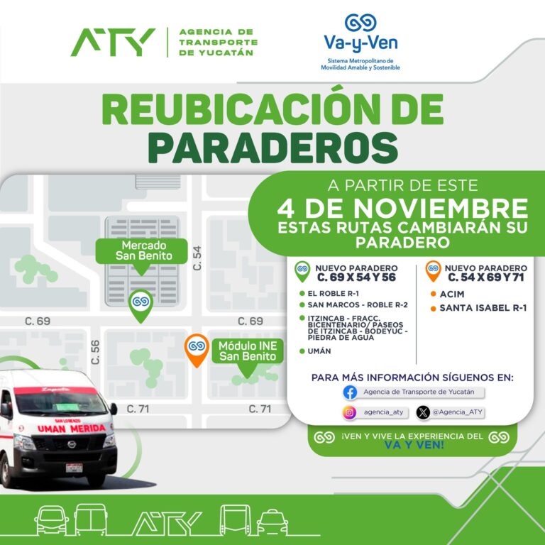 Mérida, Yucatán, 2 de noviembre de 2024.- La Agencia de Transporte de Yucatán informa que para una mayor seguridad y brindar un mejor servicio y atención a las y los usuarios del Sistema de Transporte Público Va y Ven, a partir del próximo lunes 4 de noviembre se realizará la reubicación de paraderos de forma permanente de las siguientes rutas: