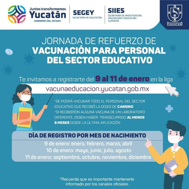 “Es muy importante seguir las indicaciones que se publican por los canales oficiales para poder llevar un proceso ordenado y garantizar que las maestras, maestros y todos quienes forman parte del sistema educativo yucateco puedan contar con la dosis de refuerzo de la vacuna”, destacó Liborio Vidal.