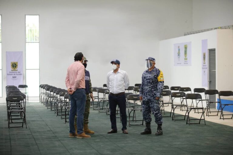 Acompañado también del Comandante de la Base Aérea Militar número 8, General de Ala Piloto Aviador Juan Ángel Jardón Aguilar; y del titular de la Secretaría de Salud (SSY), Mauricio Sauri Vivas, Vila Dosal recorrió las áreas que fueron habilitadas para el registro, triage, vacunación y recuperación en esta unidad deportiva.