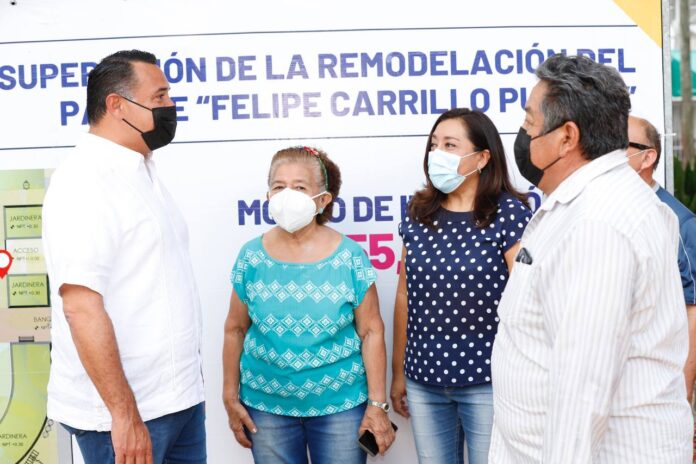 Acompañado de las vecinas y vecinos integrantes del Comité de Contraloría Social del Parque Felipe Carrillo Puerto, del Secretario de Participación Ciudadana, Julio Sauma Castillo y de los directores Martha Elena Gómez Nechar (Contraloría), David Loría Magdub (Obras Públicas) y José Collado Soberanis, (Servicios Públicos Municipales), el Primer Edil supervisó la rehabilitación del parque Felipe Carrillo Puerto que, en breve, ofrecerá un nuevo diseño debido a que se reconstruye de acuerdo a las necesidades planteadas por la ciudadanía.