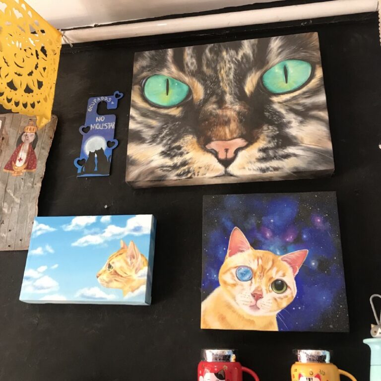 Su tienda cuenta con gran variedad de productos para hacer felices a los amantes de los gatos, tienen desde calcetines, pulseras, collares, aretes, cuadros, plumas, tazas, tienen los siempre populares gatitos enojones y mucho arte realizado tanto por artistas locales como nacionales.