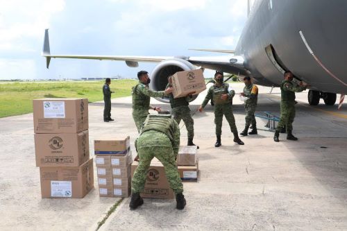 En el arribo del nuevo cargamento de vacunas también estuvo el Teniente Coronel Piloto Aviador Marco Durán García, Comandante Accidental de la BAM número 8 y el Coronel Gustavo Caratachea Esparza, comandante del 11 Batallón de Infantería.