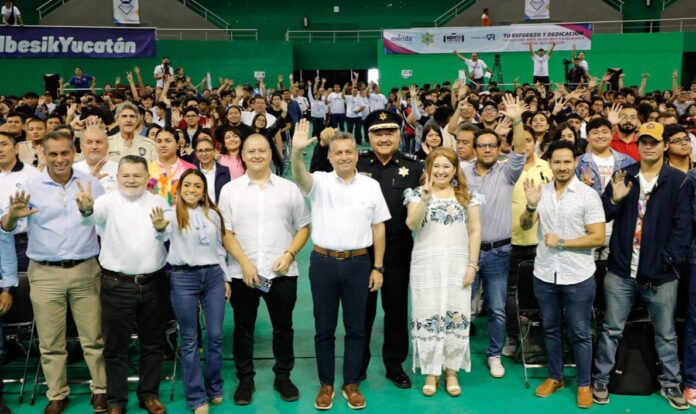 Mérida, Yucatán 1 diciembre de 2023-. Ante 2,500 estudiantes y representantes de diversas escuelas del municipio, el Alcalde Alejandro Ruz Castro encabezó la clausura del programa “Voy al Volante, Conduzco a mi Futuro”, que durante más de dos meses llevó platicas y actividades de prevención del consumo de drogas y de alcohol a 12 mil alumnas y alumnos de 25 universidades y preparatorias de Mérida.