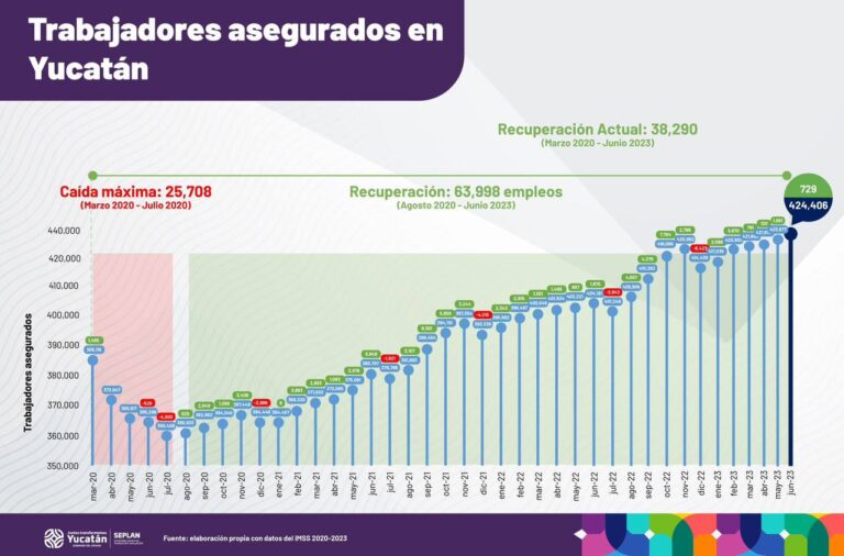 Mérida, Yucatán, 6 de julio de 2023.- Yucatán continúa incrementando la cifra de trabajadores asegurados y nuevamente rompe su propio récord histórico, al registrar, en el pasado mes de junio, un total de 424,406 afiliados al Instituto Mexicano del Seguro Social (IMSS), nuevo máximo histórico de empleos formales en la entidad, desde que se tiene registro, resultado de la estrategia que impulsa el Gobernador Mauricio Vila Dosal para mejorar la economía de las familias.