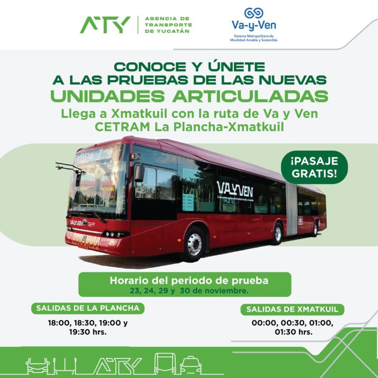 La Agencia de Transporte de Yucatán (ATY), informó que los horarios de las unidades articuladas serán: los días sábado 23, domingo 24, viernes 29 y sábado 30 de noviembre, con las siguientes salidas: